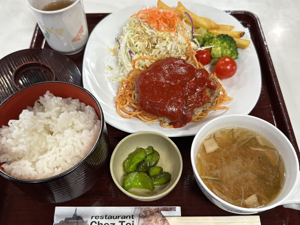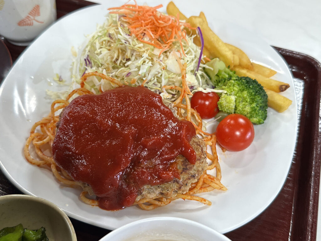 ハンバーグの下にはナポリタン。